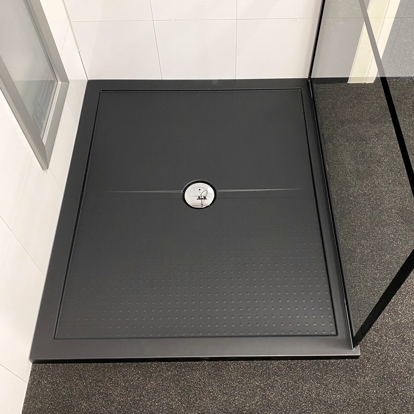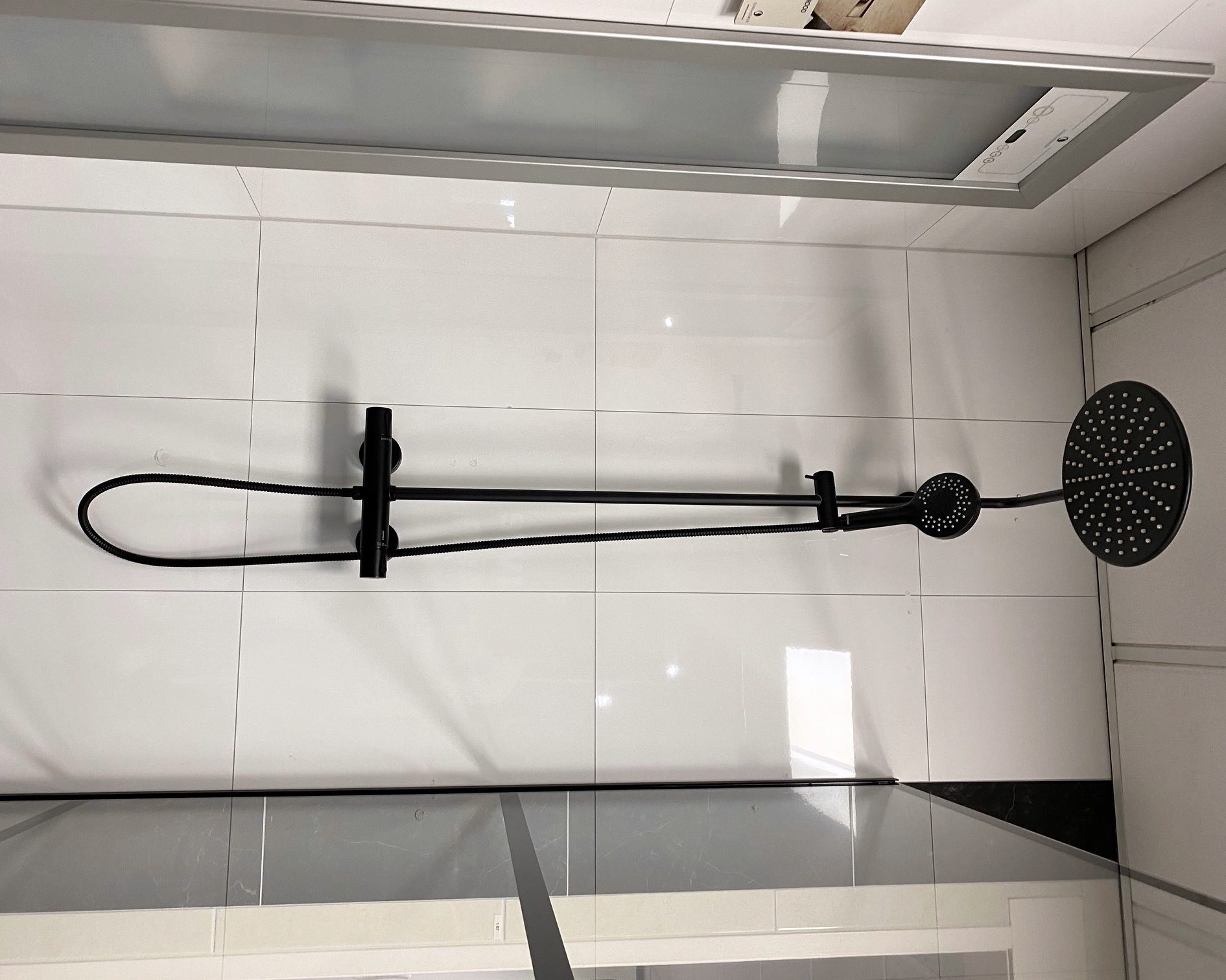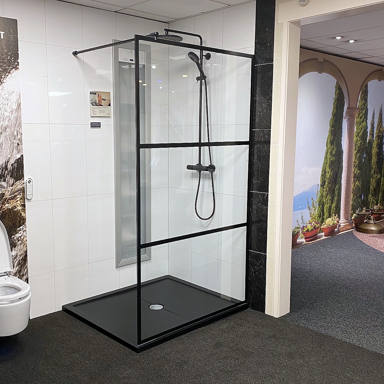 Deze mooie matzwarte douchehoek is een sierraad voor de nieuwe badkamer van nu. Een matzwarte showerpipe, een matzwarte douchebak en een douchewand met matzwarte details.
