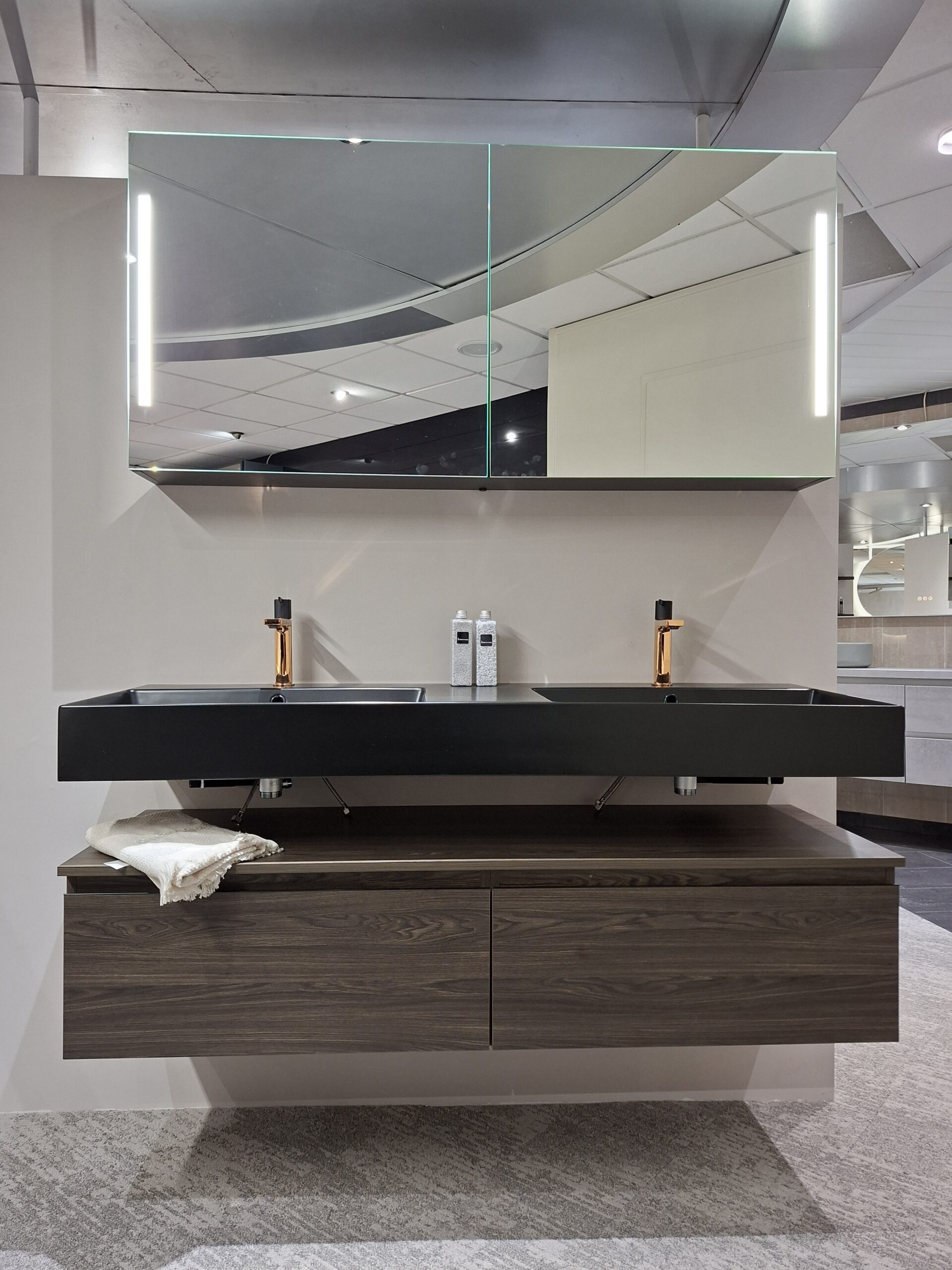 Krachtig en Elegant Ontwerp: Het keramische wastafelblad van maar liefst 12,5 cm dik straalt pure luxe uit. Met twee ruime waskommen in mat zwart is dit meubel een echte eyecatcher. De onderkast in Café Noir hangt vrij onder de wastafel, wat zorgt voor een moderne look én extra opbergruimte voor al je badkameraccessoires.