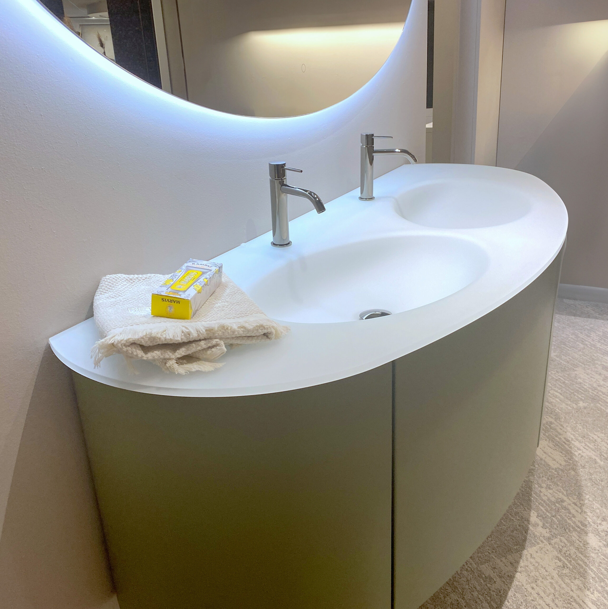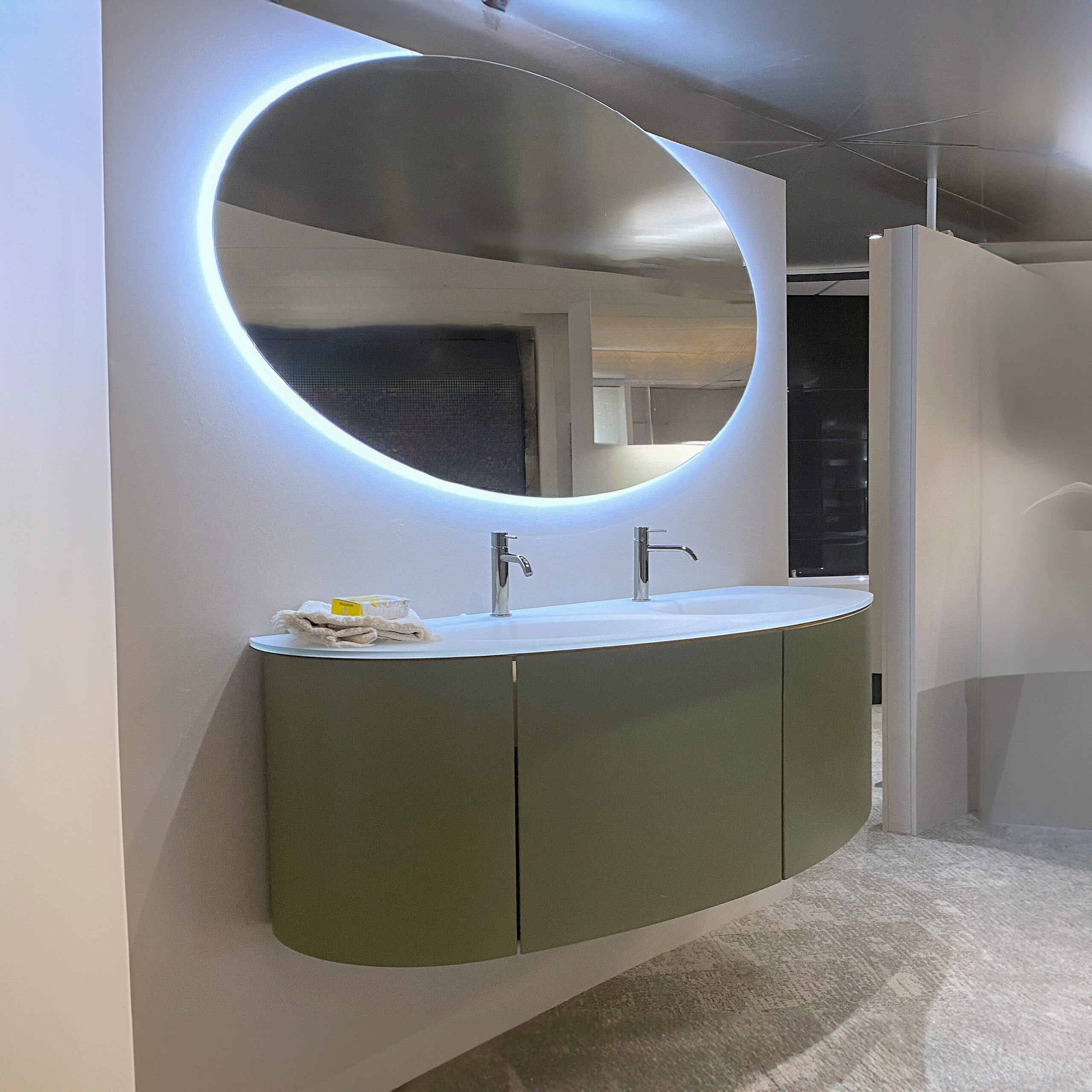 Dit badkamermeubel in olijfgroen valt direct op door de zachte, ronde vormen en de natuurlijke kleur. Het ontwerp brengt rust en balans in je badkamer en sluit perfect aan bij moderne en eigentijdse interieurs.