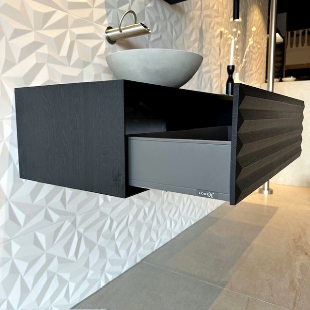 Laat je badkamer spreken met dit unieke badmeubel van massief zwart eiken in een stijlvolle retro look. De elegante wave-afwerking geeft het meubel een speels, organisch karakter, terwijl de zachte vormen van de lichtgrijze Ceramic Raw opzetwastafel prachtig contrasteren met het donkere hout.