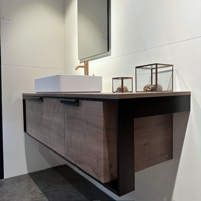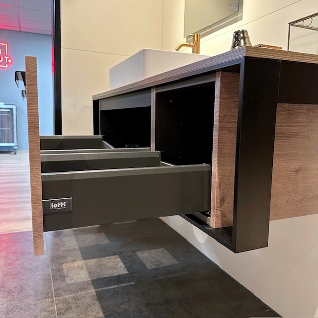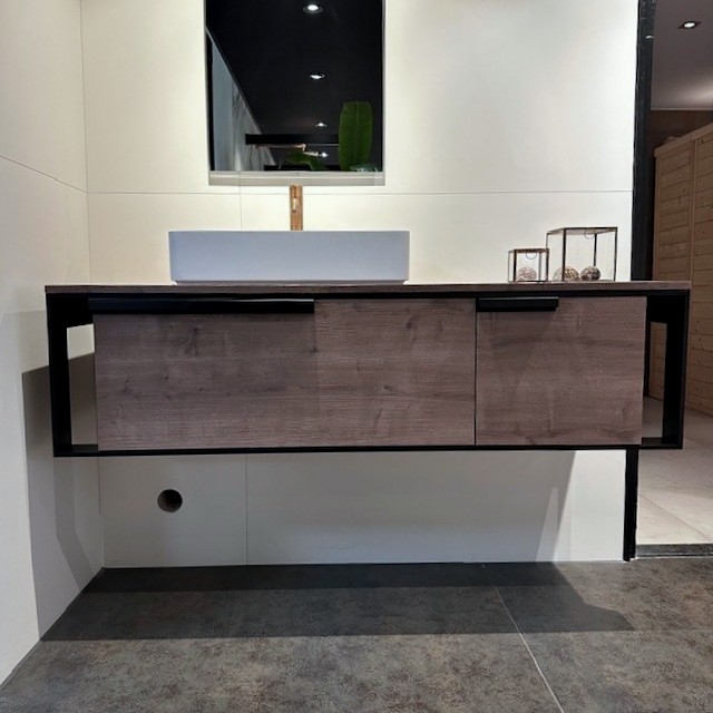 Het Novellini Cenitmetro 150 badmeubel combineert robuust zwart staal met het warme karakter van Rovero Fiemme houtdecor. Deze exclusieve showroomaanbieding is perfect afgestemd op het bijpassende vrijstaande Novellini Divina bad en tilt jouw badkamer naar een geheel nieuw designtijdperk.
