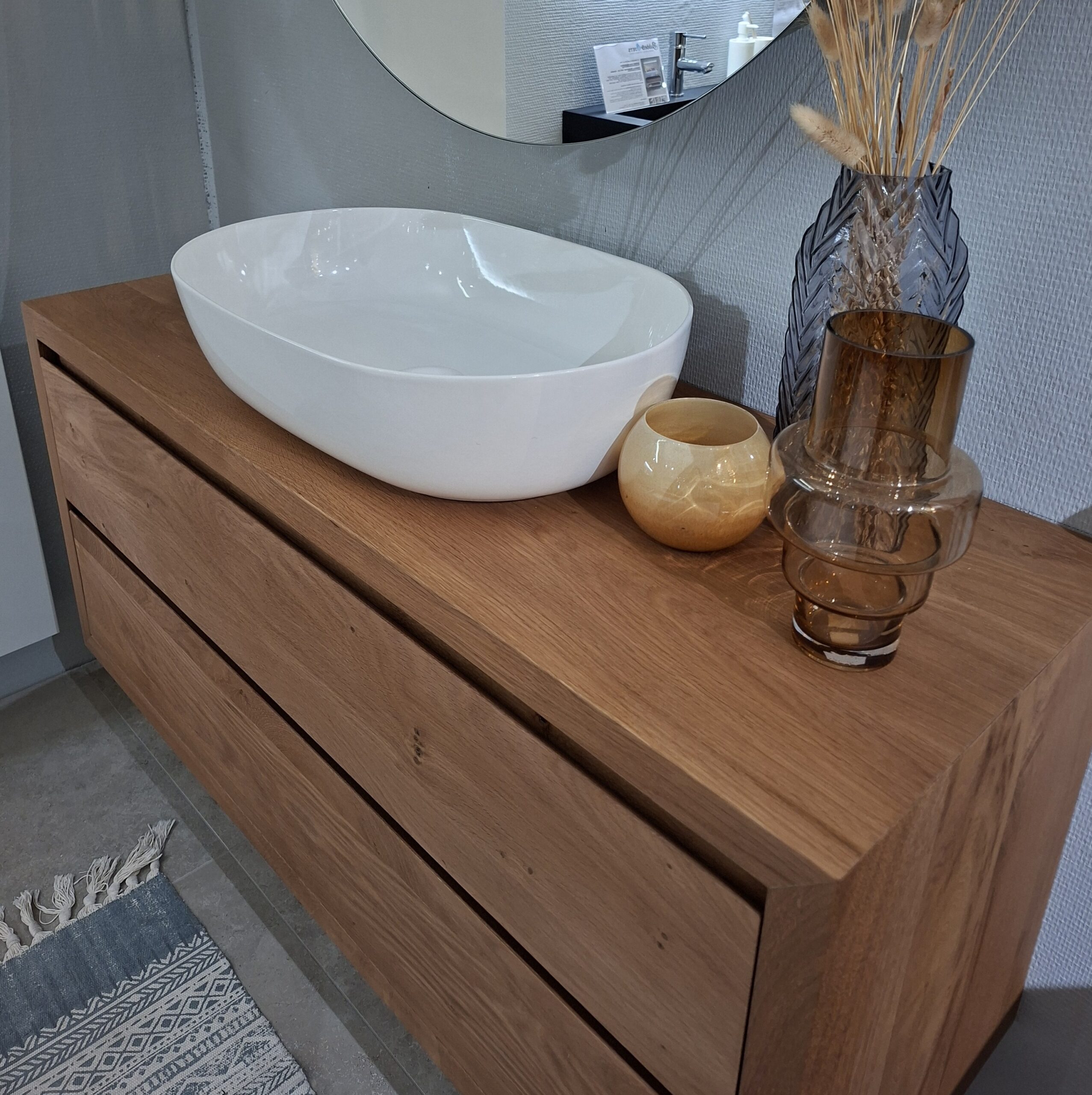 De combinatie met de elegante ovale opzetwastafel in wit glanzend keramiek zorgt voor een mooi contrast tussen warm hout en fris wit. De markante ronde spiegelkast met open zijkanten maakt het geheel compleet en geeft het meubel een open, eigentijdse uitstraling. Samen vormen ze een badkamermeubel dat opvalt, maar nooit schreeuwerig wordt. Twents nuchter, maar wel met klasse.