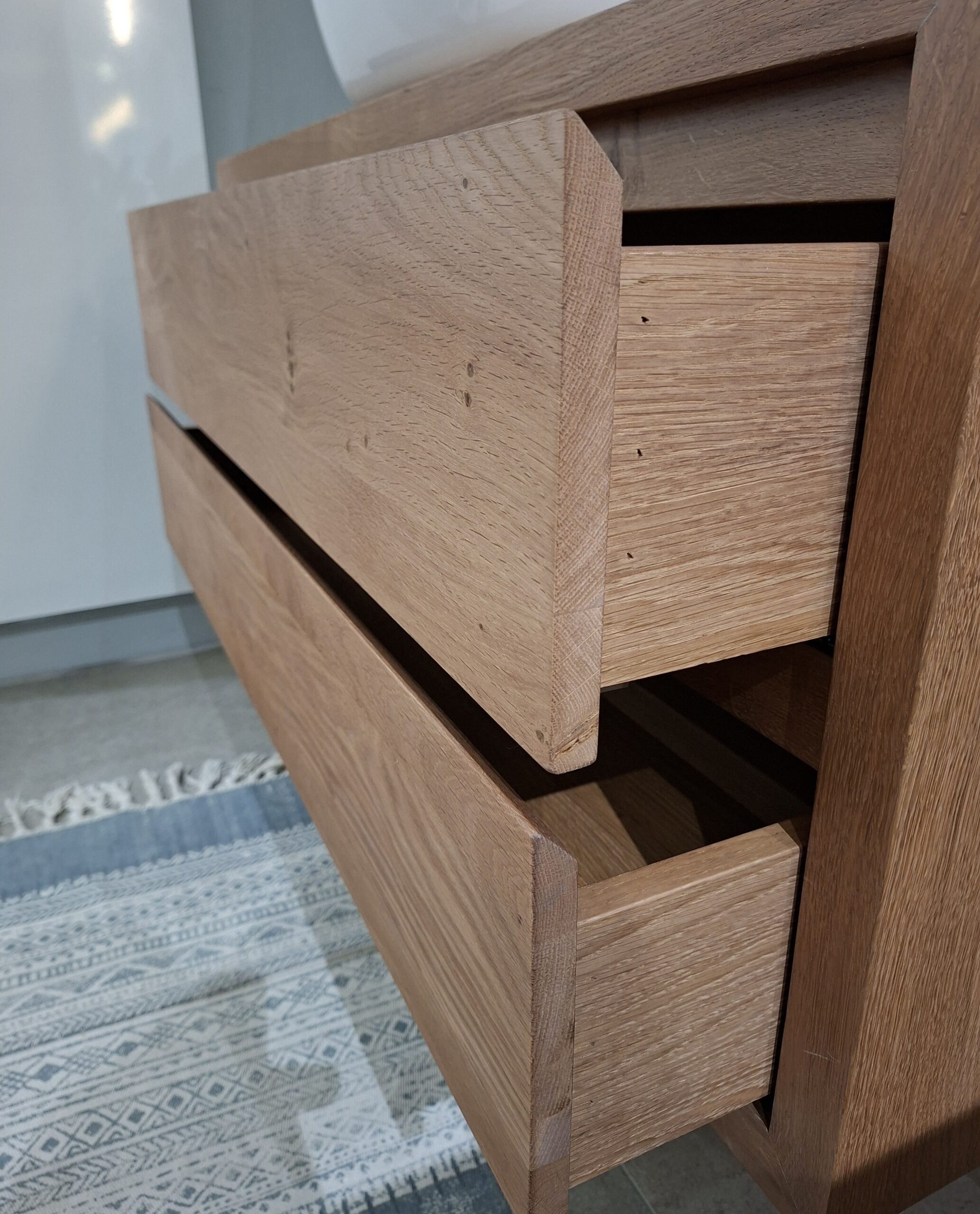 De massief eiken onderkast is rondom voorzien van een 4 cm dikke eiken rand, wat het meubel een robuuste en solide uitstraling geeft. De ladefronten zijn eveneens massief eiken, terwijl de lade-interieurs zijn afgewerkt met eiken fineer. De naturel afwerking laat het hout spreken: warm, levendig en tijdloos. Precies wat je wilt in een badkamer waar je graag de dag begint – en rustig afsluit.