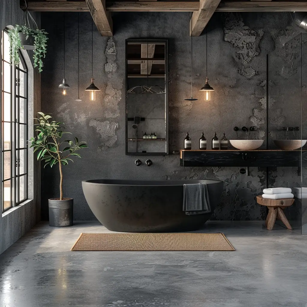 Een industriële badkamer herken je meteen aan de opvallende mix van robuuste materialen, neutrale kleuren en minimalistische inrichting. Materialen zoals beton, baksteen, staal en hout spelen een grote rol en geven deze badkamer zijn kenmerkende stoere en authentieke uitstraling. Zwarte of antraciete stalen elementen zoals douchewanden, spiegels en wastafelmeubels zorgen voor een strak en industrieel karakter. Vaak zie je in deze badkamers ook vrijstaande baden of ruime inloopdouches met glazen wanden die het ruimtelijke gevoel versterken. De kleuren blijven ingetogen en rustig, voornamelijk zwart, wit, grijs en aardetinten. Bovendien past het gebruik van industriële verlichting, zoals vintage lampen of metalen wandlampen, perfect in deze stijl en draagt het bij aan de robuuste sfeer. Deze unieke combinatie van praktische indelingen, robuuste materialen en stijlvolle details maakt de industriële badkamer tot een aantrekkelijke keuze voor wie houdt van een eigentijds interieur met karakter.