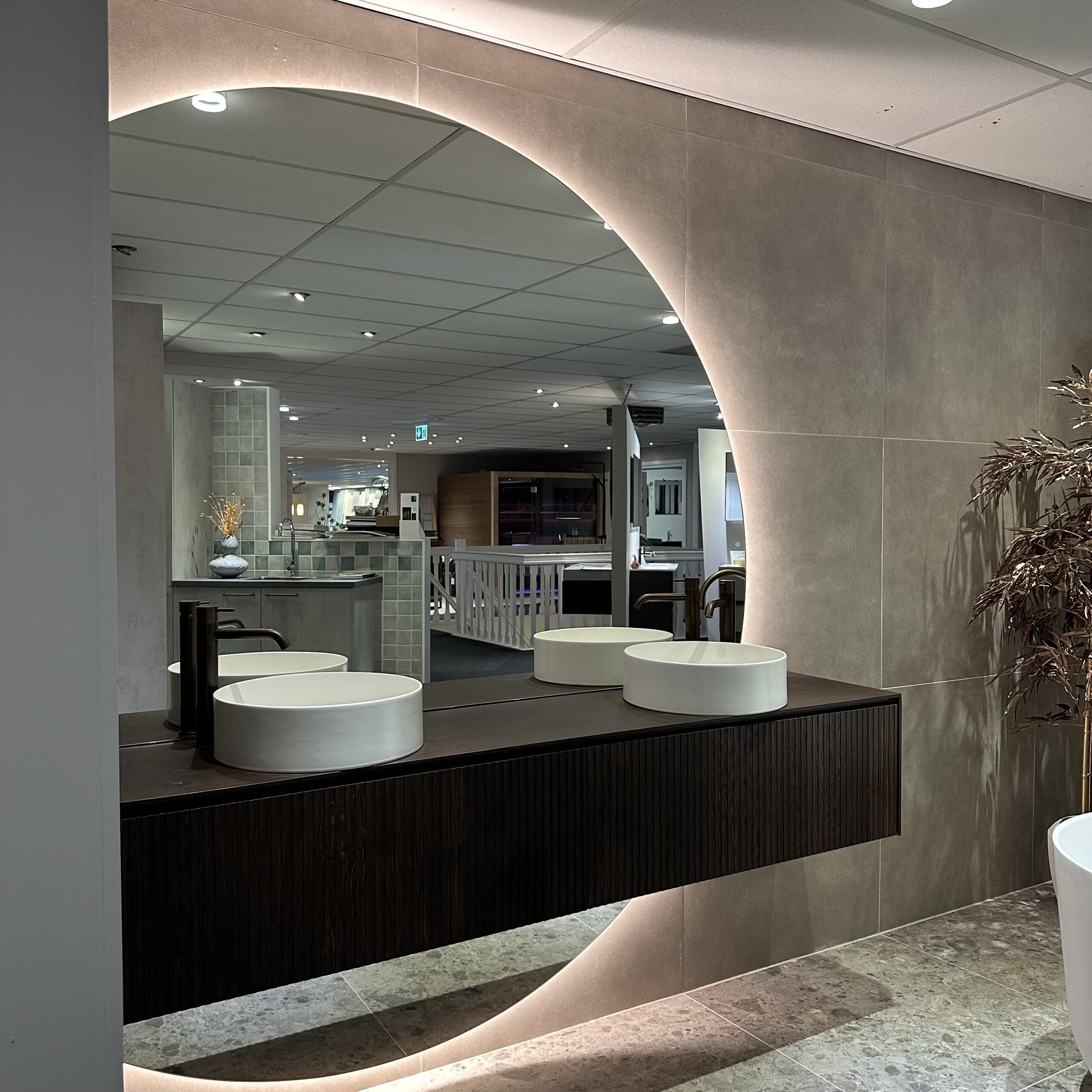 Eyecatcher van formaat is de grote ronde spiegel, waarvan de unieke vorm zelfs subtiel onder de spiegel doorloopt. Deze vloeiende ronding voegt een vleugje zachtheid toe aan het strakke design en vergroot tegelijkertijd het ruimtelijke gevoel.