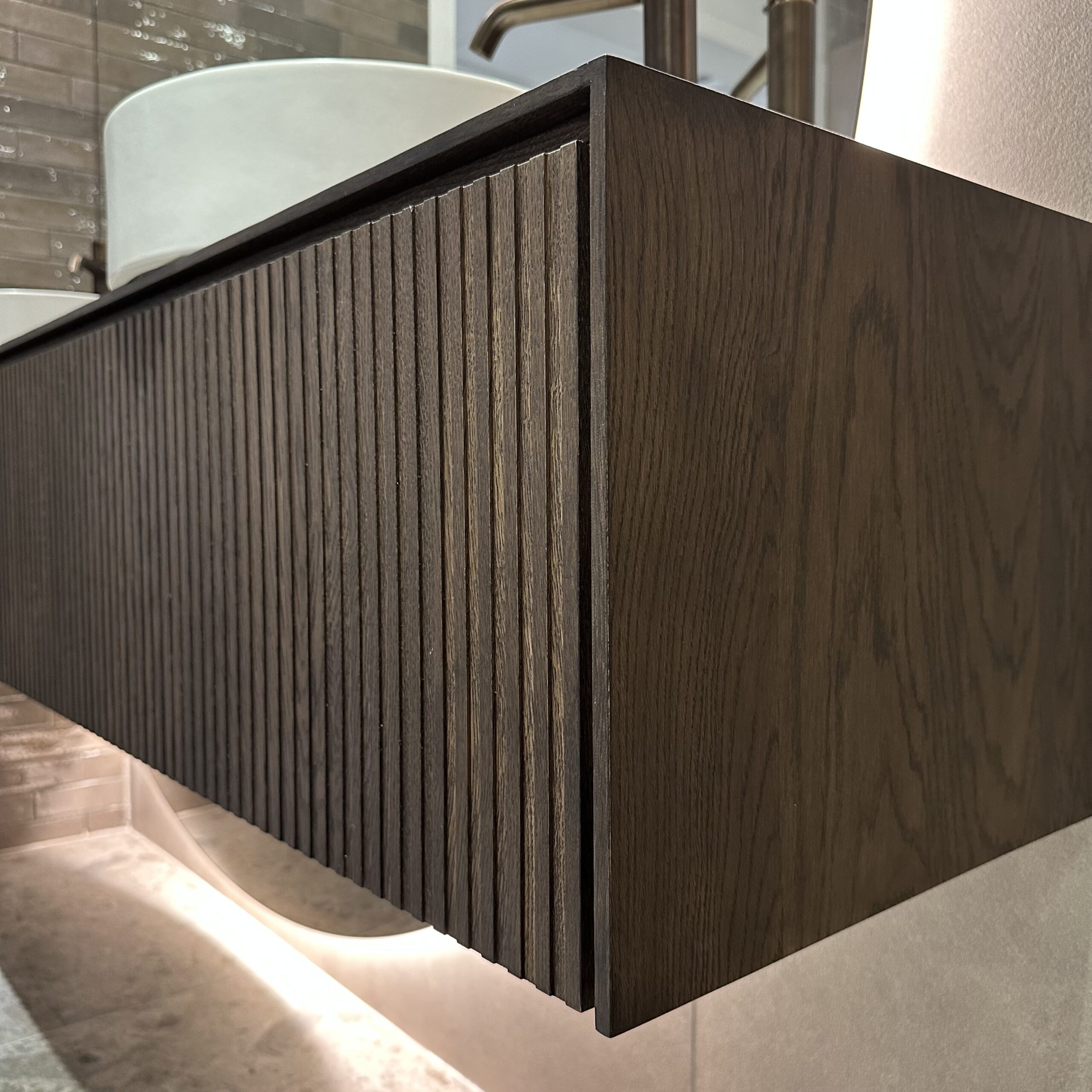 Het massief eiken meubel van met lades in een trendy ribbel optiek geeft de badkamer een natuurlijke en tijdloze uitstraling. Deze moderne twist op klassiek eikenhout biedt niet alleen veel opbergruimte, maar is ook een echte blikvanger.