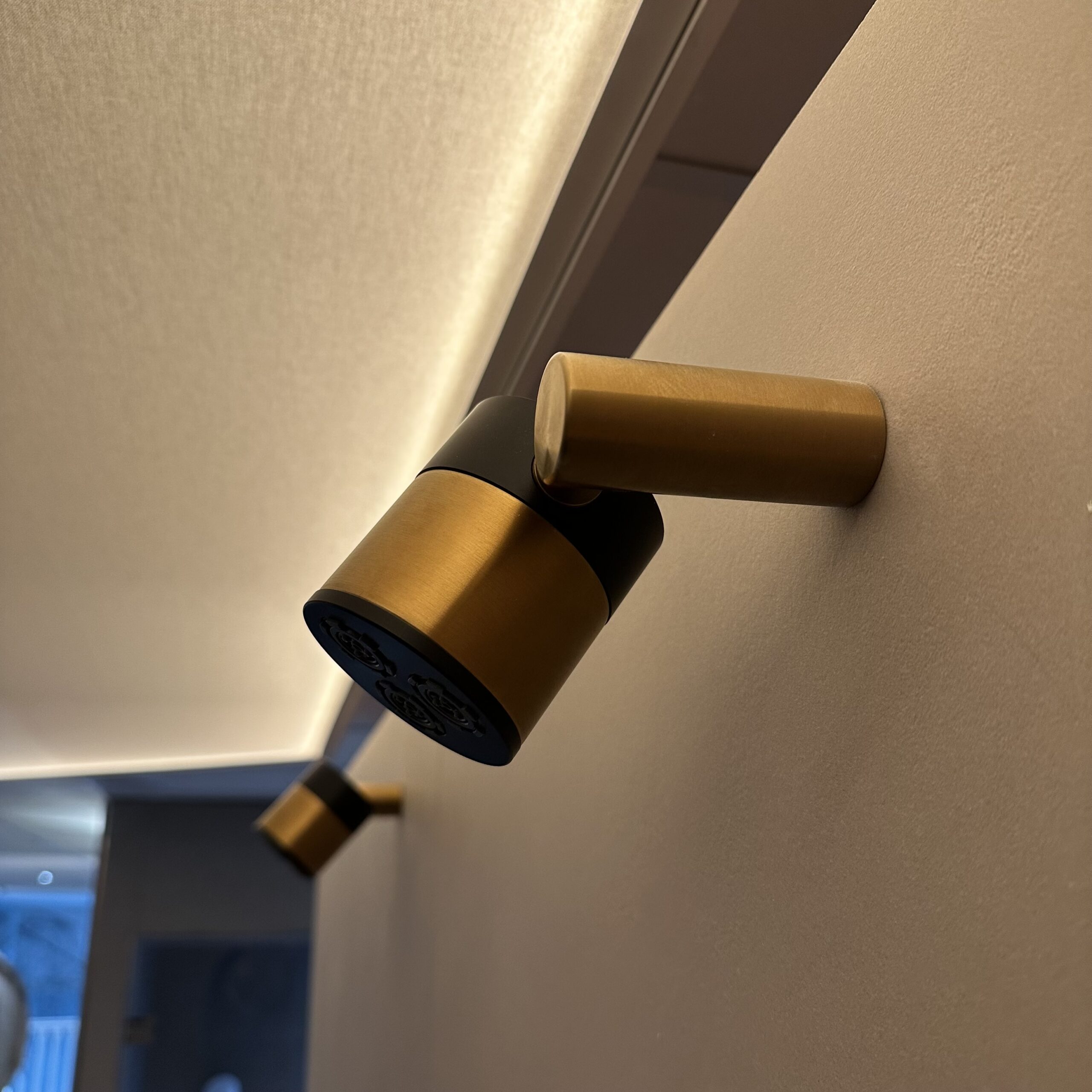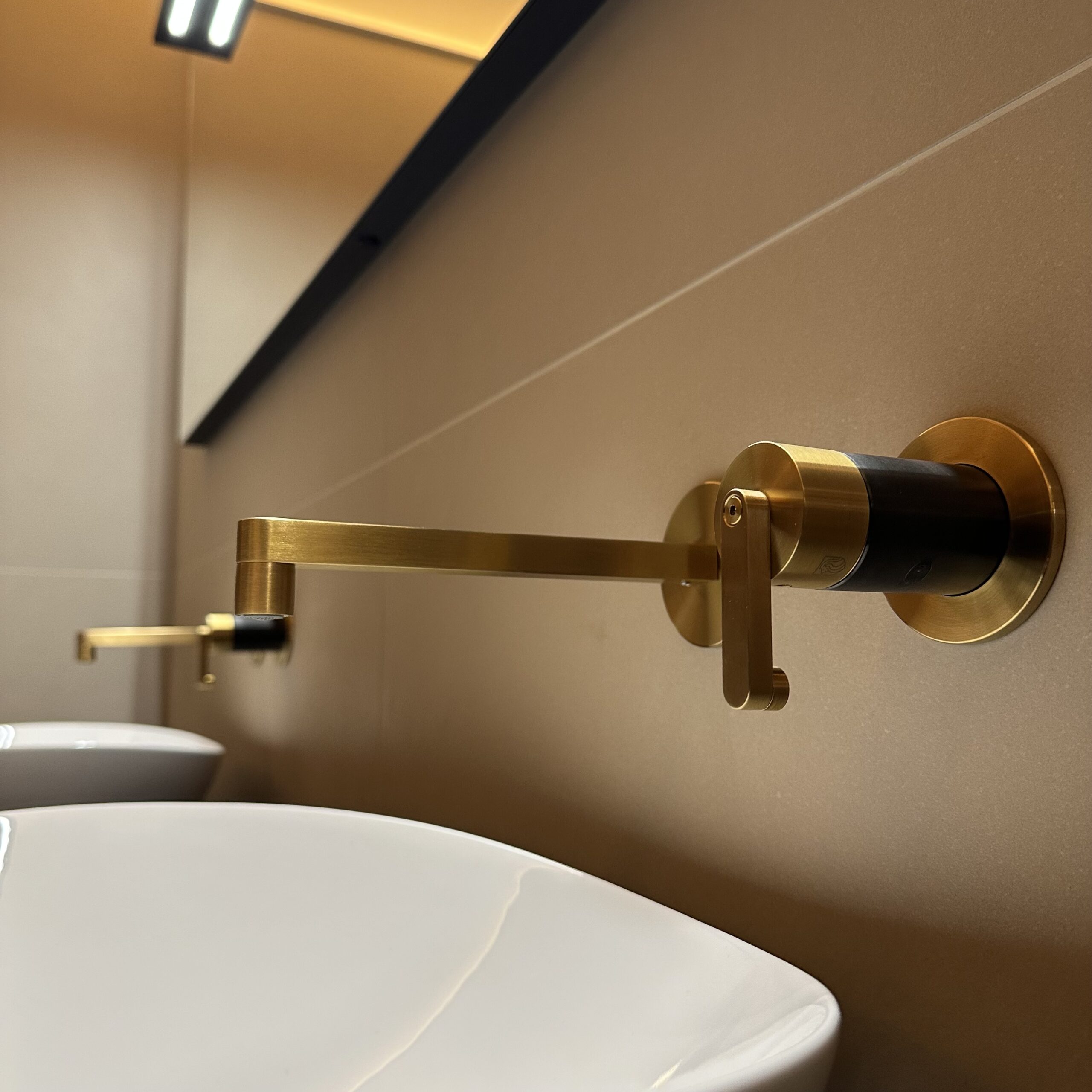 ✨ Alle kranen – van douche tot inbouw wastafelkraan bij het badmeubel – zijn van Radomonte, vervaardigd uit 100% RVS. De verfijnde brass PVD-afwerking in combinatie met mat zwart geeft een luxueus en tijdloos contrast.