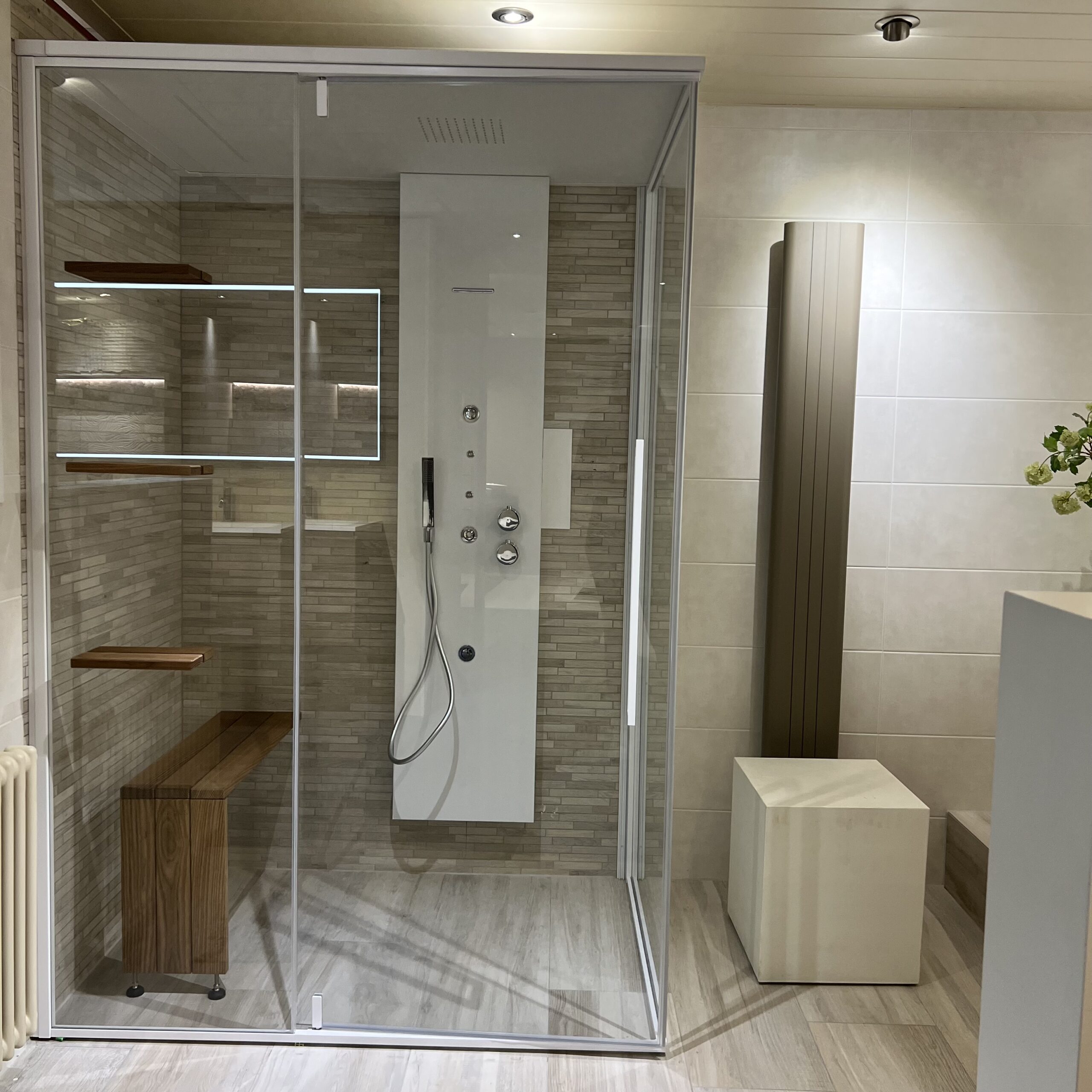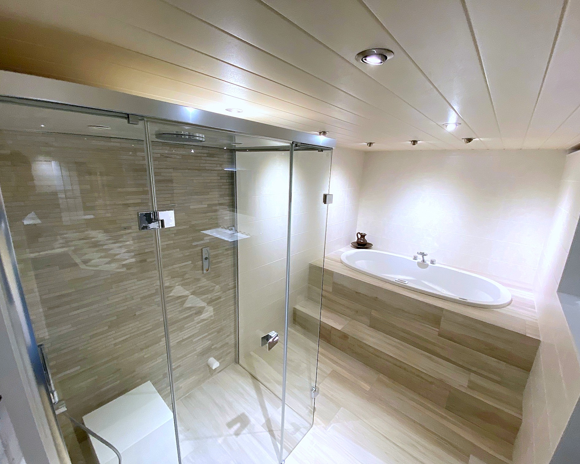 De Xenz stoomcabine en Cleopatra whirlpool maken badkamer Kaprun tot een ware wellness topper. De modulaire Xenz stoomcabine kunt u helemaal aanpassen aan uw wensen en ruimte. Een ding blijft echter altijd hetzelfde en dat is dat enorm lekkere stoomklimaat. DE Cleopatra pareva is een whirlpool uit de luxus line. Waarschijnlijk de whirlpool waarin je je het diepst kunt onderdompelen. Door de nieuwste Keramische parket tegels krijgt de ruimte een rustgevende natuurlijke uitstraling. Een wellnessbadkamer pur sang.