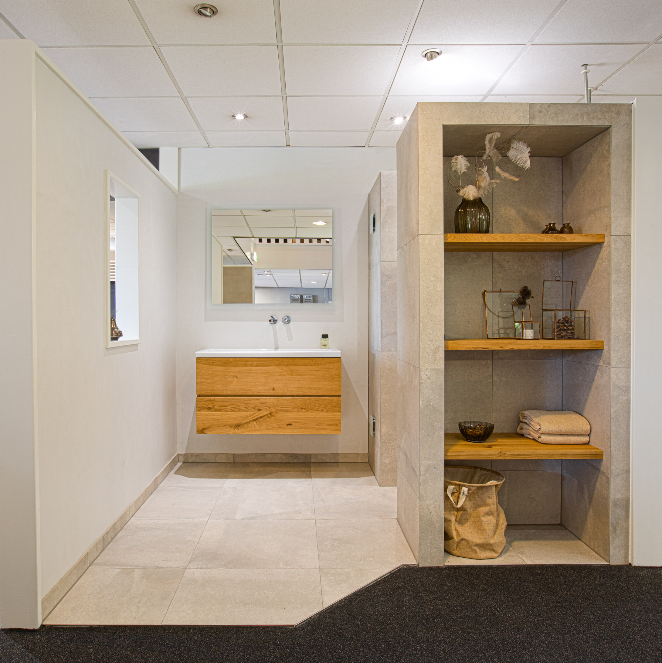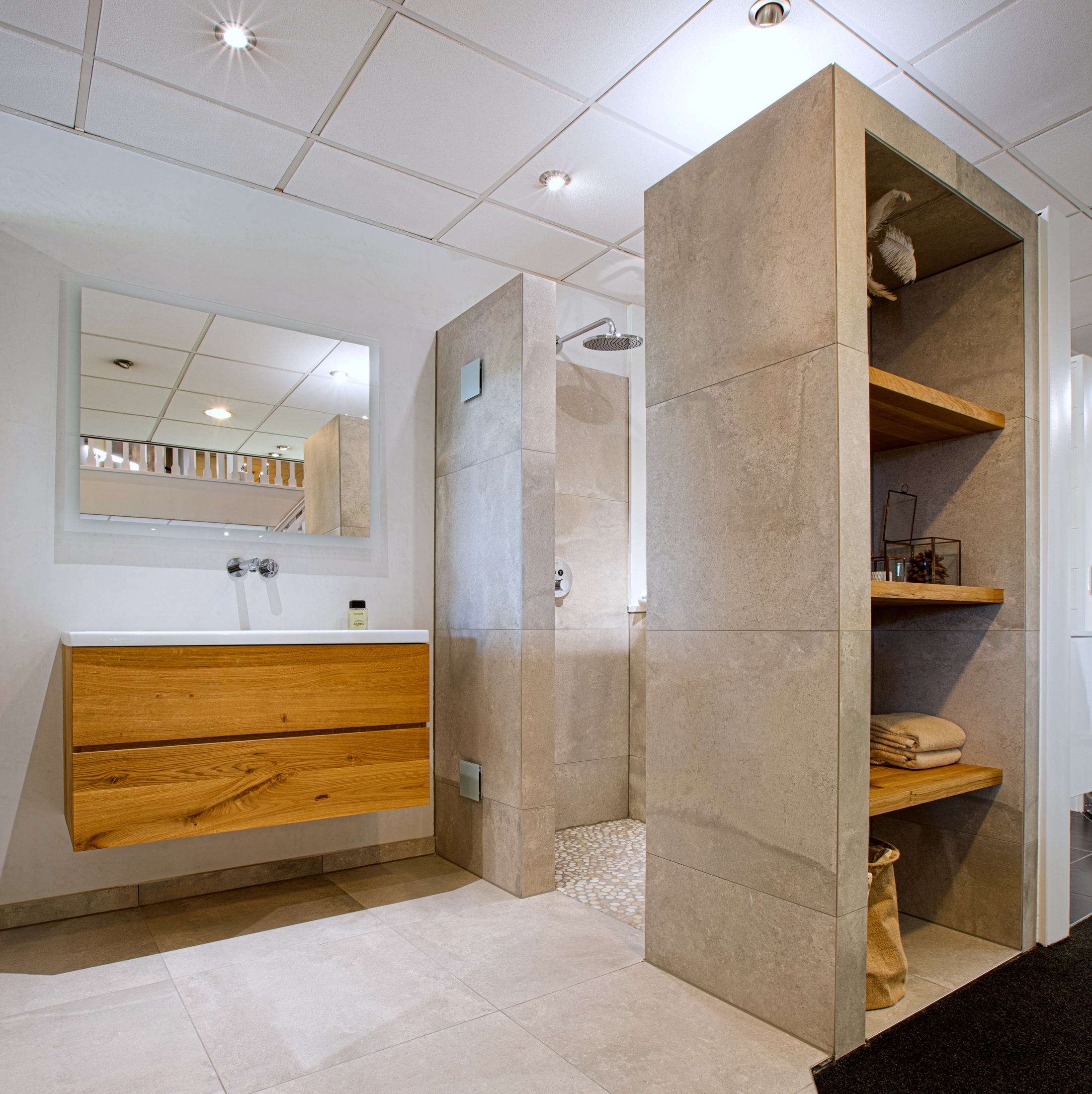 Badkamer Lecco is helemaal van nu. Puur natuur licht maar toch ook nostalgisch. Het massief eiken houten badmeubel met de keramische bak en de eiken houten nis planken worden nog op traditionele wijze op maat gemaakt. Puur vakmanschap, maar dan in een eigentijds jasje. Ook de grote 60 x 60 wandtegels en de kiezelvloer in de douche passen daar helemaal in. De Axor inbouwkranen in de douche en bij de wastafel geven veel comfort. Met de Sunshower infra rood lamp breng je ook nog wellness in je badkamer.