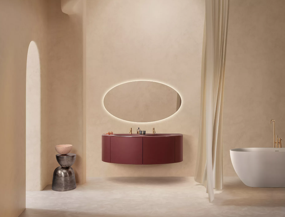 De look wordt compleet gemaakt met de bijpassende ovale spiegel, voorzien van subtiele indirecte LED-verlichting rondom – een perfecte balans tussen sfeer en functionaliteit.