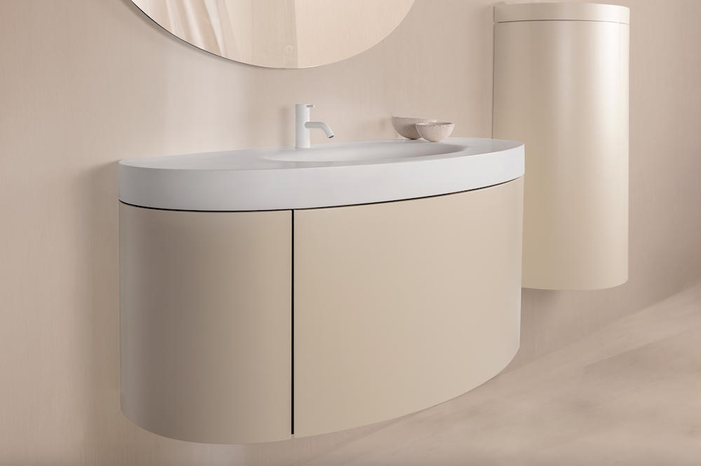Het ovale meubel heeft zowel een gebogen front als elegante, afgeronde zijkanten, wat zorgt voor een zachte en luxe uitstraling. Het kastwerk is volledig mat gelakt en leverbaar in alle RAL-kleuren, zodat u het meubel perfect kunt afstemmen op uw persoonlijke interieurstijl.