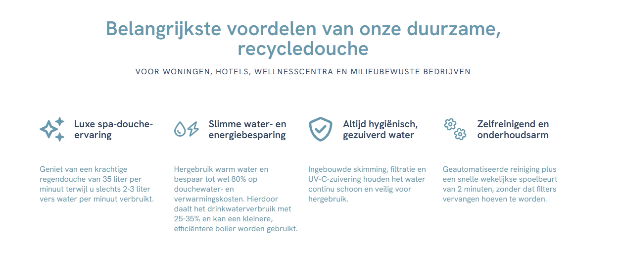 Geniet van een indrukwekkende 35 liter per minuut recycle-regendouche, waarbij water én energie continu worden hergebruikt. Goed voor het milieu, geweldig voor jou.