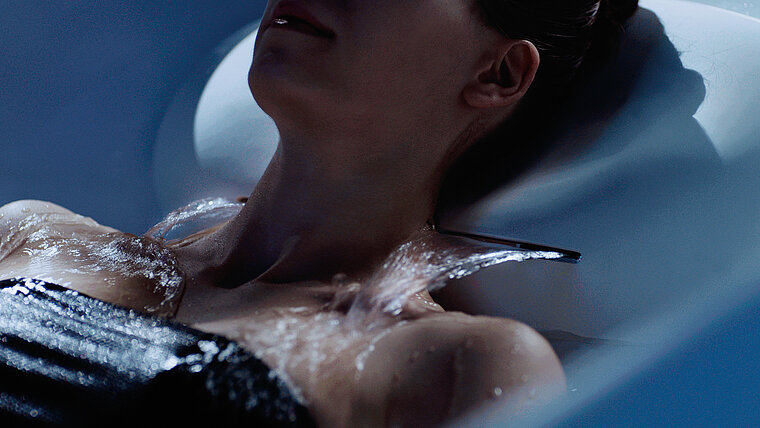 Wellness in elke druppel: Een zachte waterval uit de in hoogte verstelbare hoofdsteun verwarmt en kalmeert je nek en schouders.