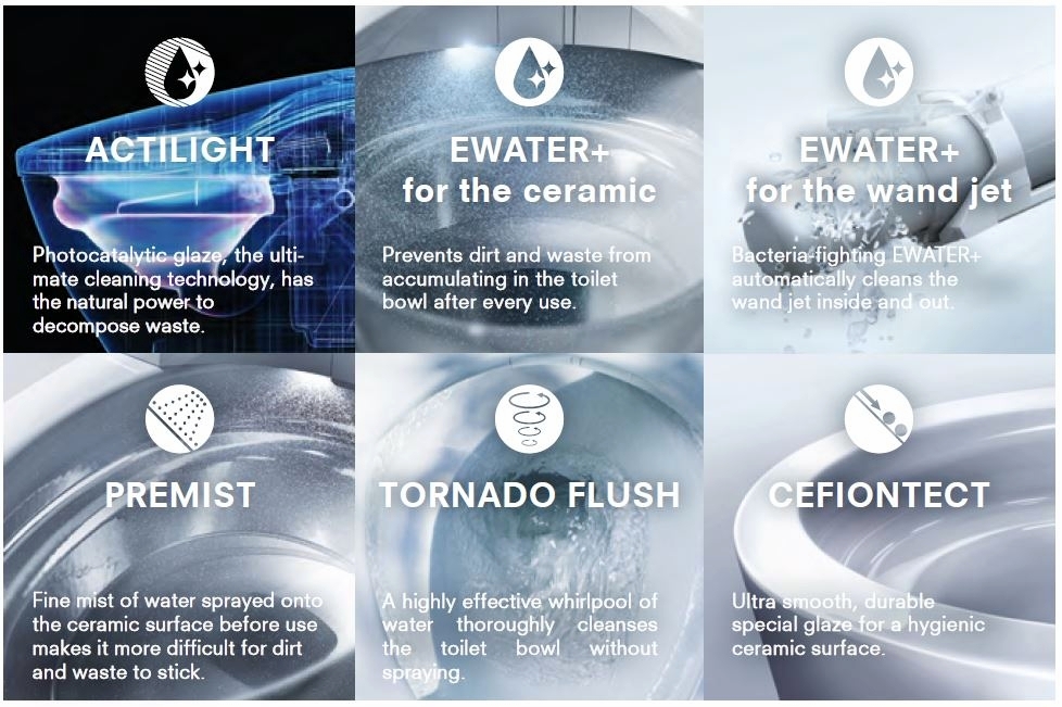 - EWATER+ & Premist: Zorgt voor extra hygiëne door gebruik van electrolytisch water en een voorgesproeide laag op het keramiek.