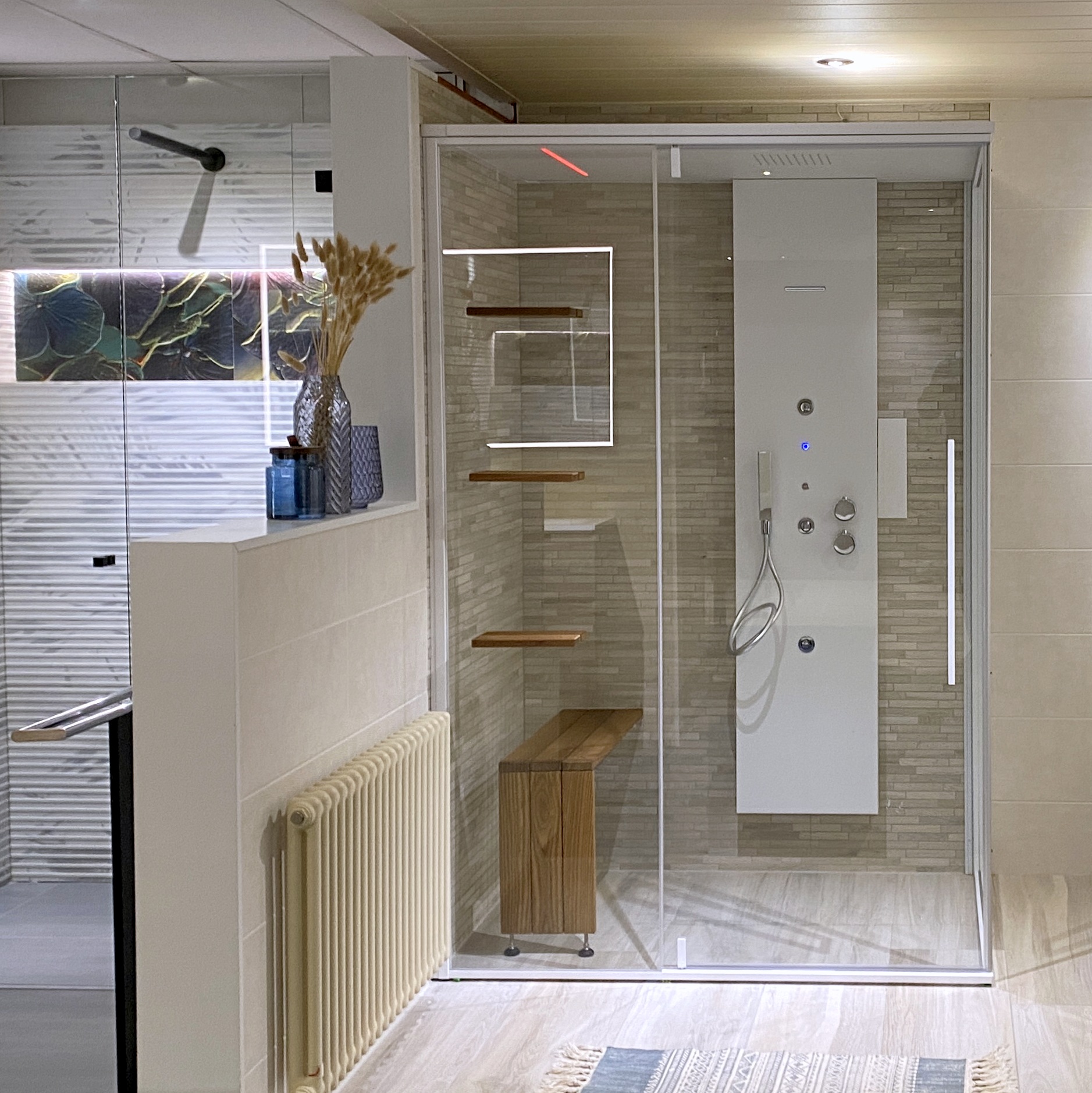 En dan is de Zen Hammam, compleet met handdouche, hydrojets, een mega-douchekop, waterval, en alle waterpret die je maar kunt bedenken. De Zen Hammam gaat echter nog een stapje verder, met een Turks bad en chromotherapie voor de ultieme zen-ervaring. Geen stress hier, alleen pure sereniteit!