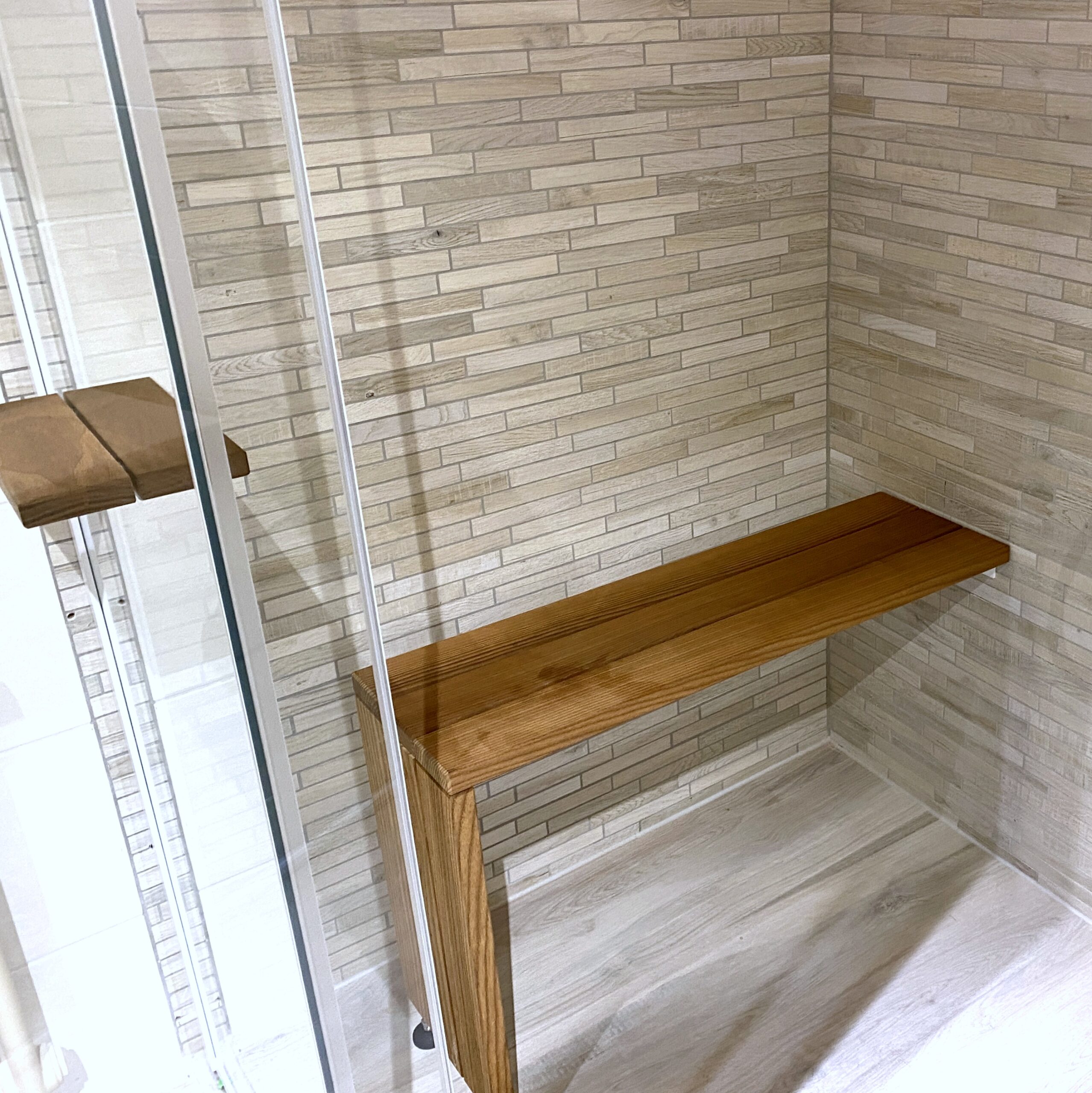 Binnenin de Zen Hammam wacht een Iroko-houten zitplaats op je, voor de ultieme ontspanning. En die draaideur met die chique lineaire staaf- of brughandgreep van 580 mm? Pure klasse!