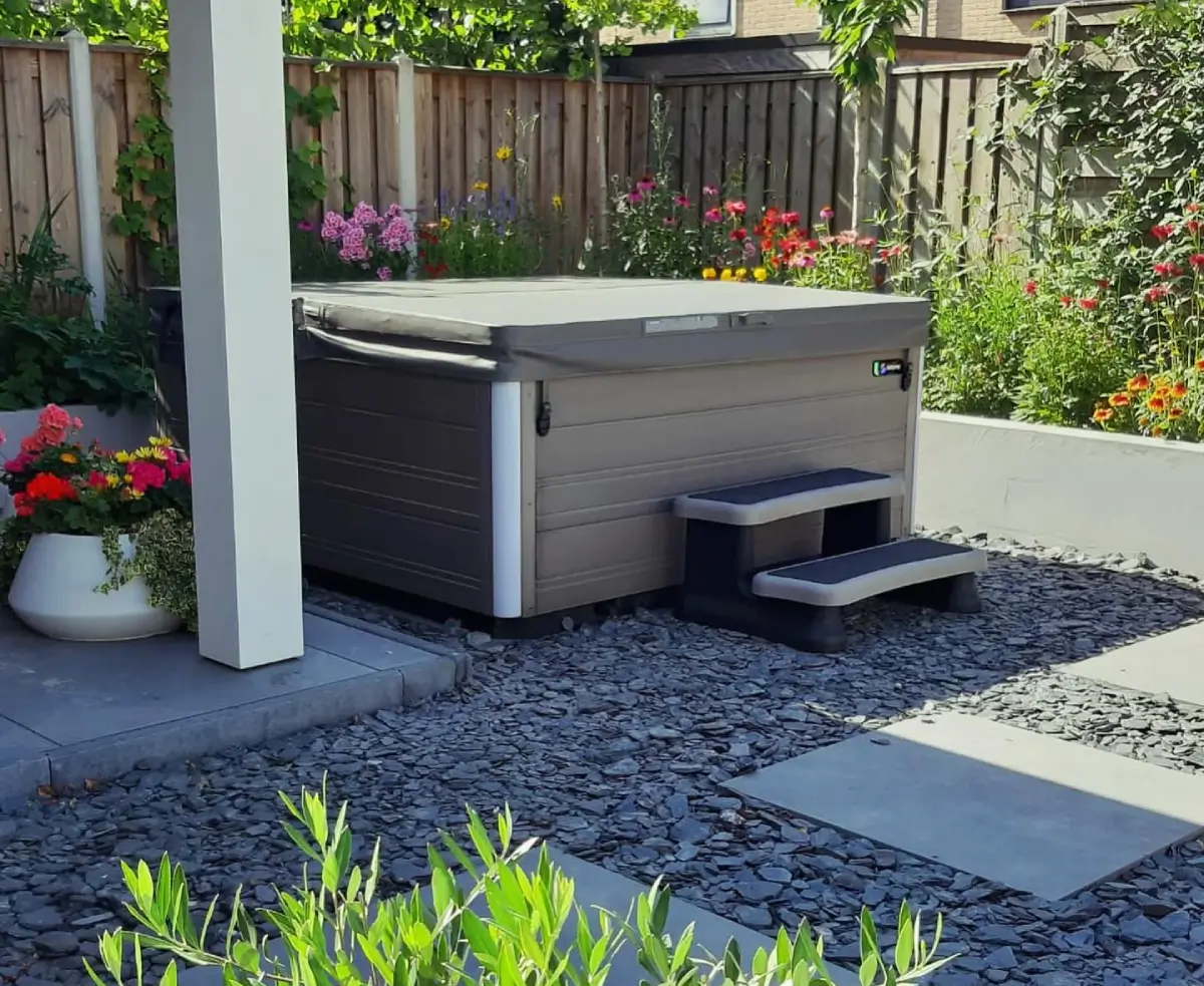 Als je een ruim terras hebt, is het een uitstekend idee om de jacuzzi hier naadloos in te integreren. Dit kan bijvoorbeeld door de jacuzzi te omringen met vlonders of het terras deels te verhogen. Hierdoor voelt de jacuzzi als een onderdeel van het terrasontwerp en blijft er voldoende ruimte over voor een zithoek of eethoek in de tuin. Voor een naadloze overgang tussen het terras en de jacuzzi kun je kiezen voor dezelfde materialen, zoals hout of tegels, zodat alles mooi samenkomt.