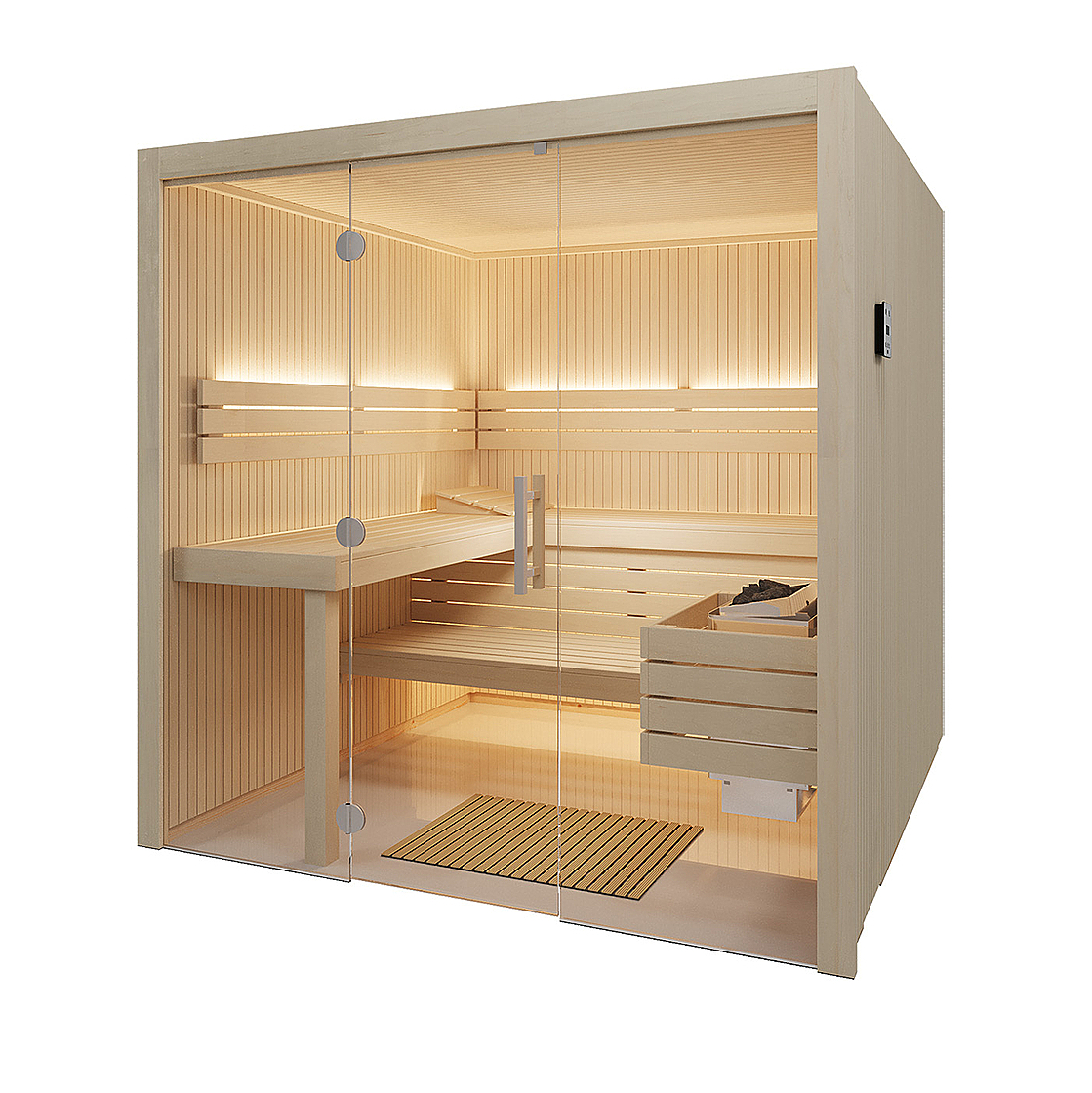 De Sauna Gracil is het toonbeeld van modern saunadesign: strak, verfijnd en tijdloos. Hoogwaardig espenhout en een opvallende verticale lamellenstructuur creëren een exclusieve, architectonische uitstraling. De royale glasfront zorgt voor een open en ruimtelijk gevoel; ideaal voor eigentijdse interieurs.