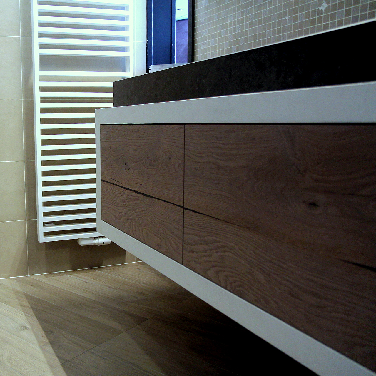 De Babylon 1400 is een hoogwaardig design meubel. De betonlisee omlijsting en de echt fineer frontafwerking in combinatie met de zwarty keramische bak maken hem tot de smaakmaker in je badkamer.